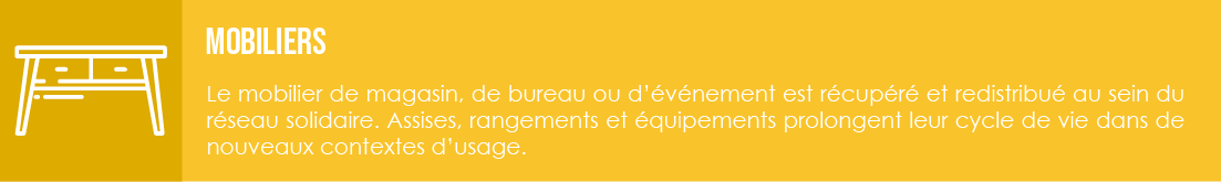 Afin de soutenir concrètement vos actions socioculturelles, nous collectons quatre familles d’éléments auprès de nos clients donateurs. Leur seconde vie s’écrit désormais au service de vos engagements.
